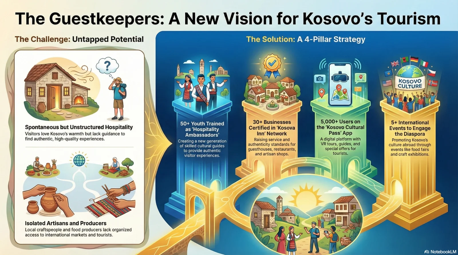 Të promovojmë trashëgiminë kulturore të Kosovës duke krijuar mundësi ekonomike për të rinjtë dhe bizneset lokale, si dhe duke forcuar lidhjet me diasporën përmes një turizmi të qëndrueshëm dhe dinjitoz.